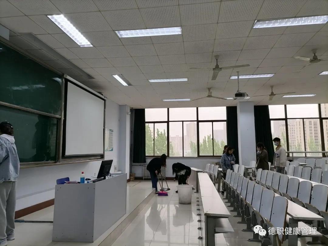 由卫生部部长赵志浩同学开会讲述打扫中的注意事项及细节,经过分组后,领取工具,同学们去往各自卫生领域进行扫除,各组热火朝天的开始,同学们分工明确,各司其职,积极主动地参与其中,扫地、抹课桌、擦玻璃、擦门框、擦灯台,整理桌堂、拖地,确保不留下任何一个卫生死角,忙得不亦乐乎。