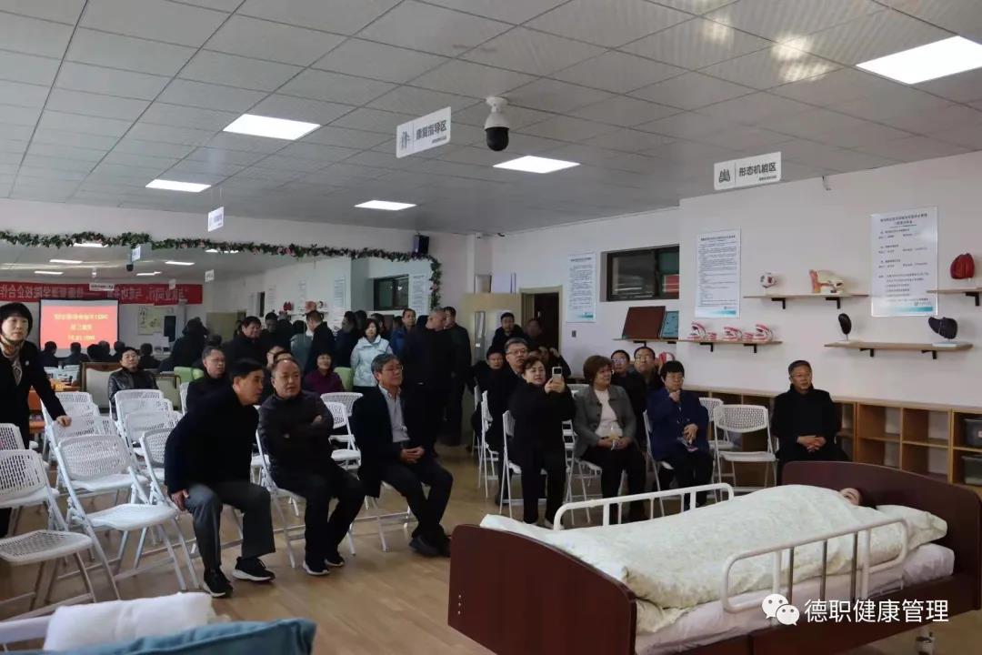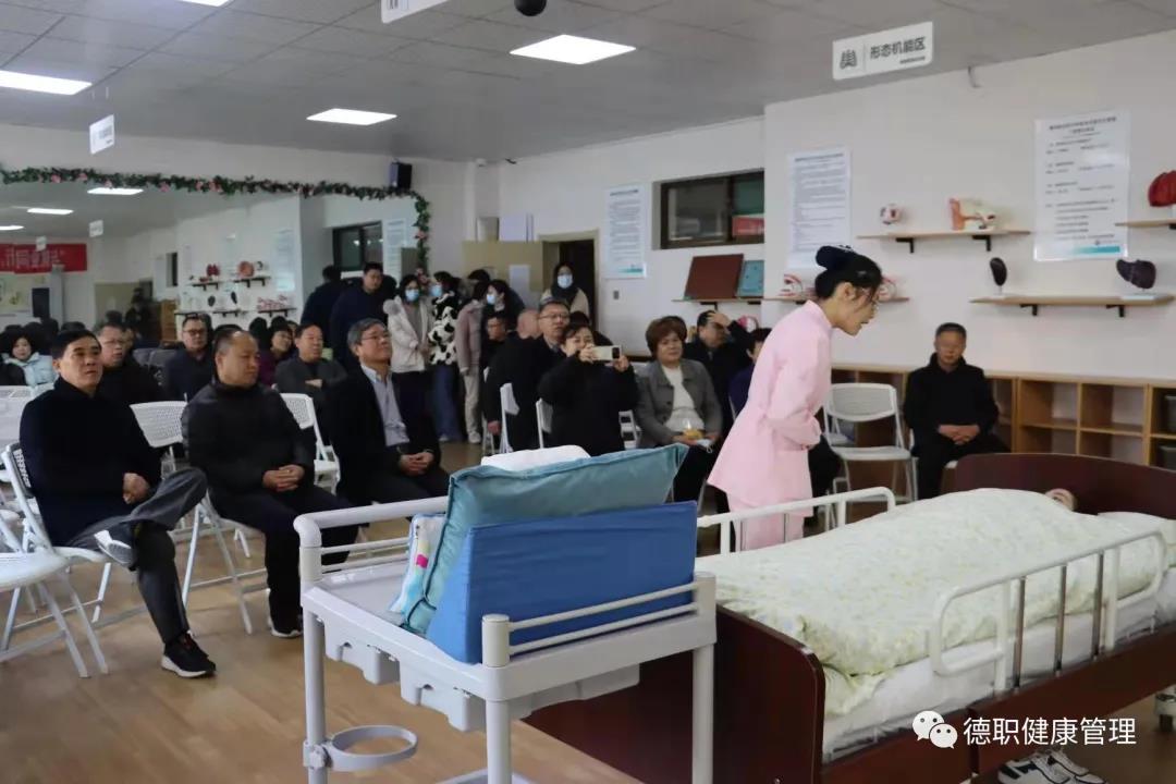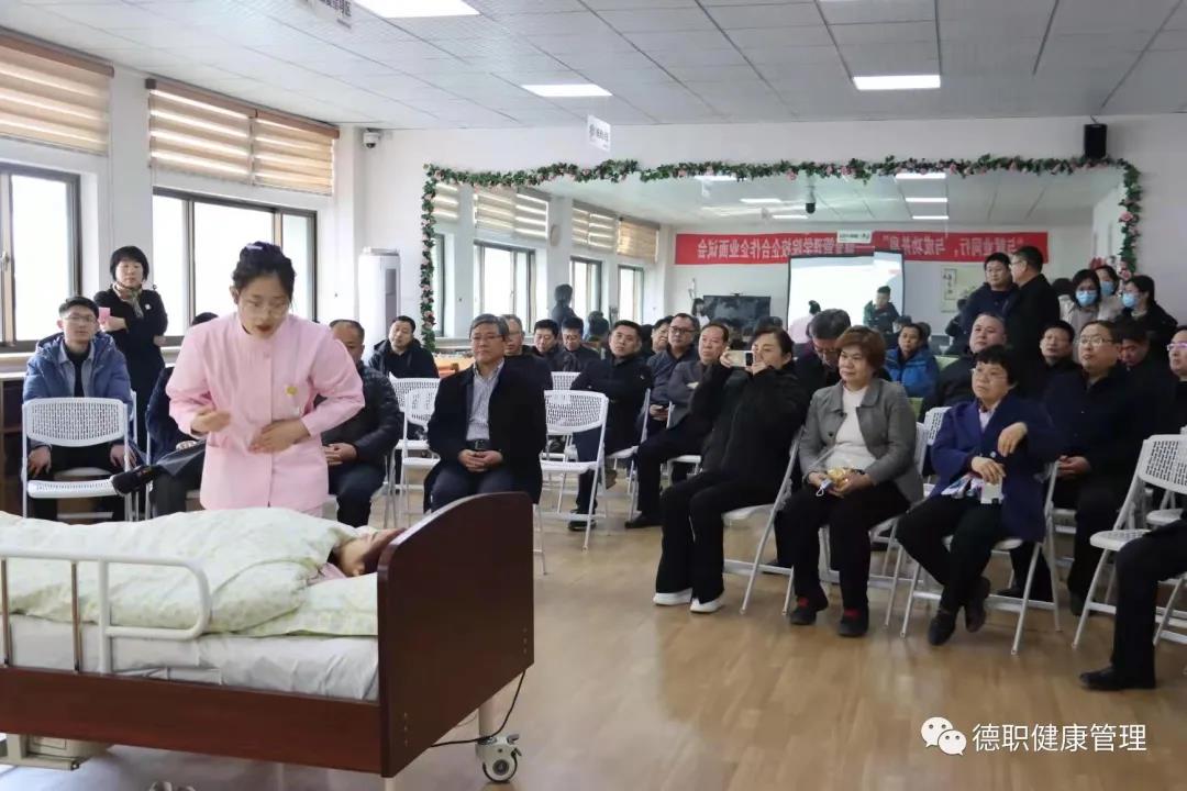 最后,刘斐斐老师介绍了公司一年来的亮点工作和技能大赛取得的成绩,指导获得省“技能兴鲁”健康照护赛项二等奖的吕莲莲同学进行“协助偏瘫老人进行床上翻身训练”的演示汇报,现场观摩团的领导和老师们认真观看,跟随汇报的同学一起模拟,大家表示这样贴近生活实际的技能非常有推广的价值。