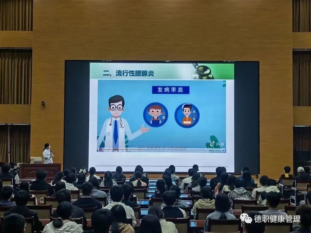 陈老师深入浅出讲解了传染病的概念,传染源、传播途径、易感人群以及如何防控等方面的健康常识。图文并茂地讲解了流感、水痘、流行性腮腺炎等春季流行性疾病特点及预防,并结合实际案例进行展示。最后提醒师生要及时接种疫苗、注意个人卫生和防护、坚持体育锻炼、合理膳食、劳逸结合,有效减少疾病的发生和传播,提高健康安全意识。