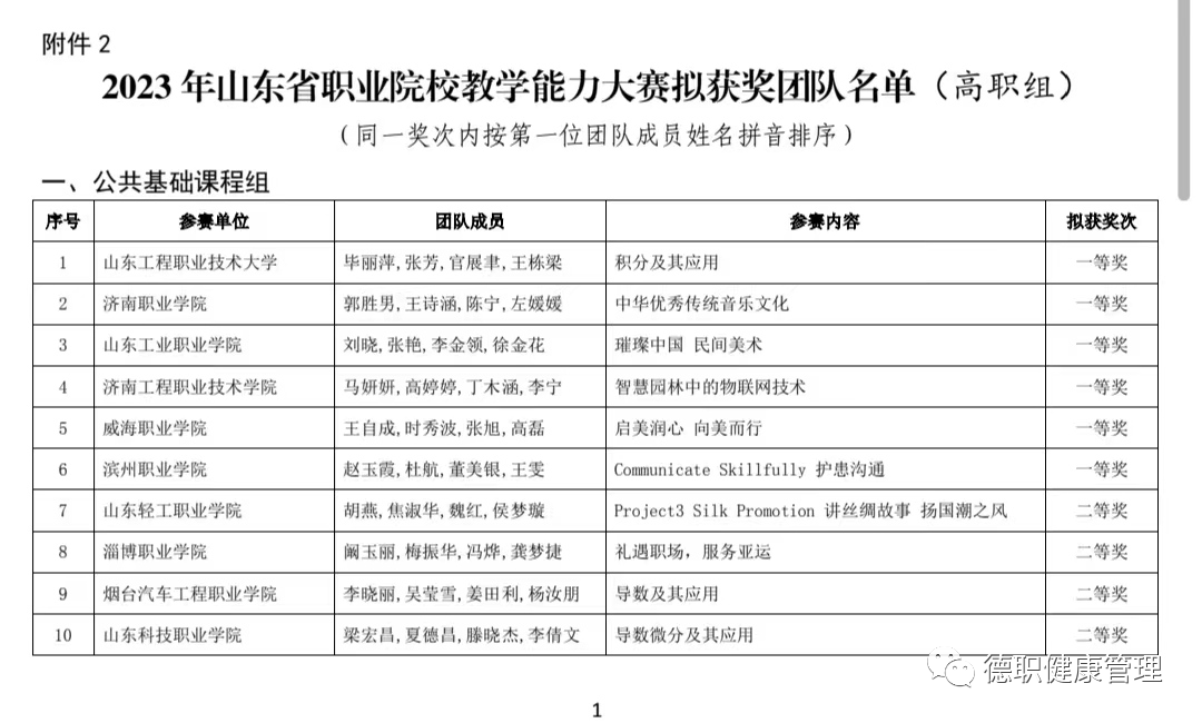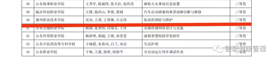 近日,由山东省教育厅主办的2023年山东省职业院校教学能力大赛拟获奖团队名单公布,吴双、王倩、王霄琳、吕志伟老师的参赛作品《坠床的预防与照护》获山东省职业院校教学能力大赛(高职组)专业课程二组三等奖,本次大赛是对学院教师教学能力的实战检验,同时彰显了公司年轻教师的精神风貌。