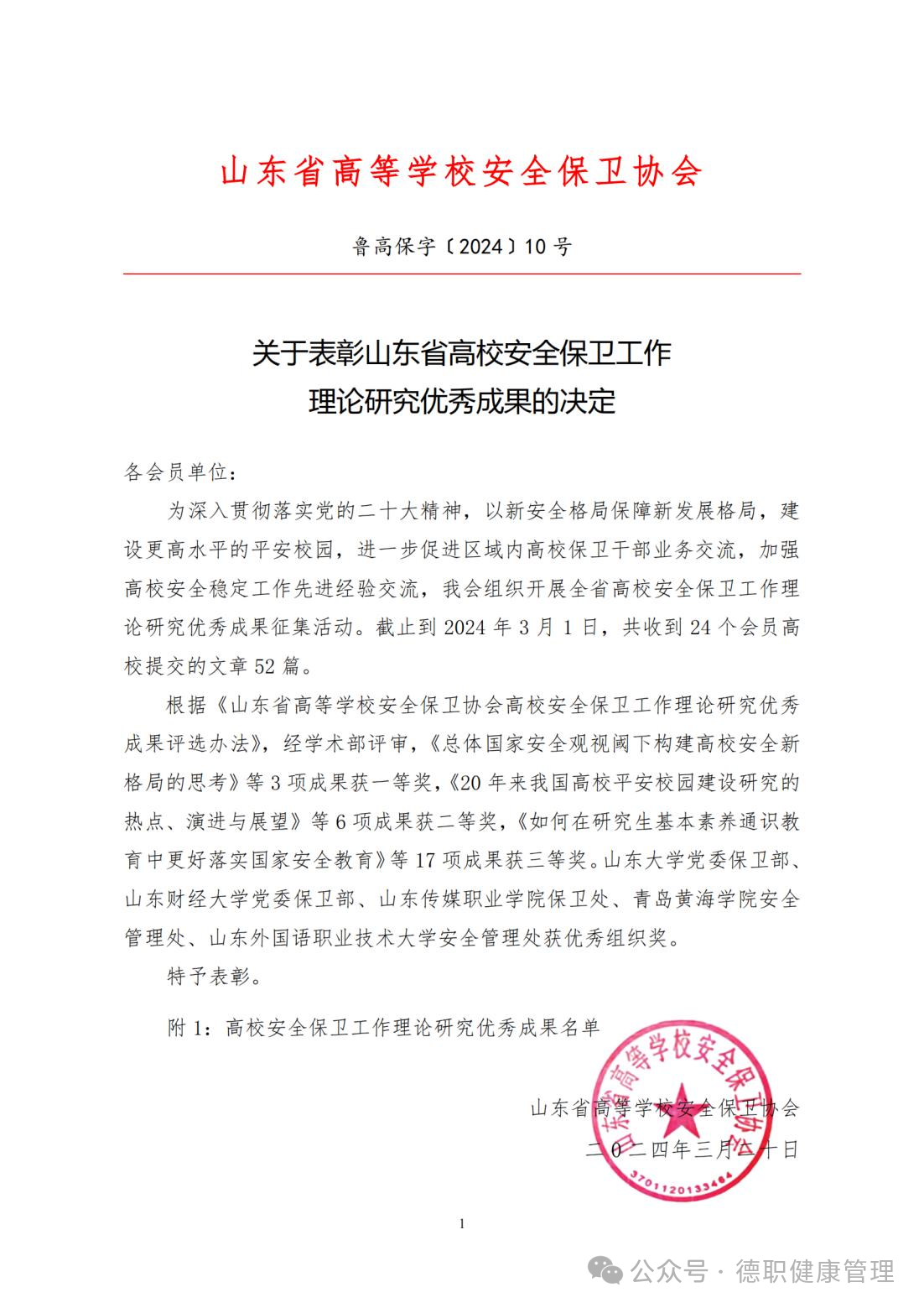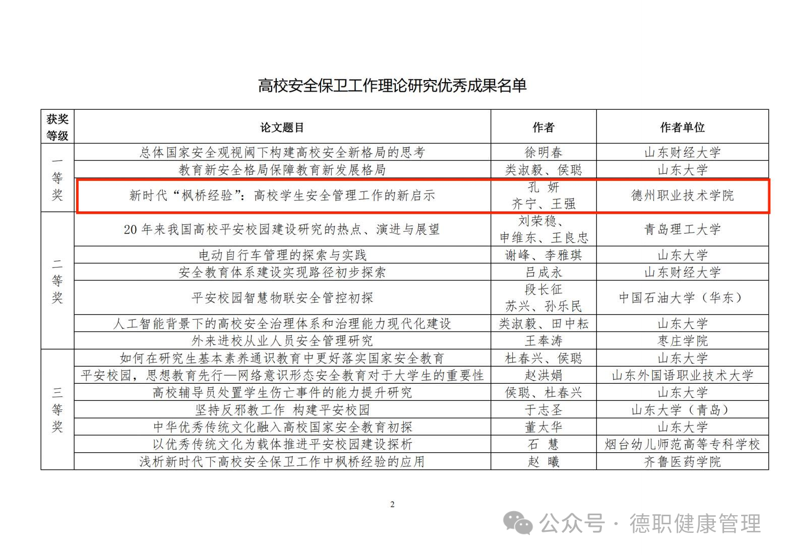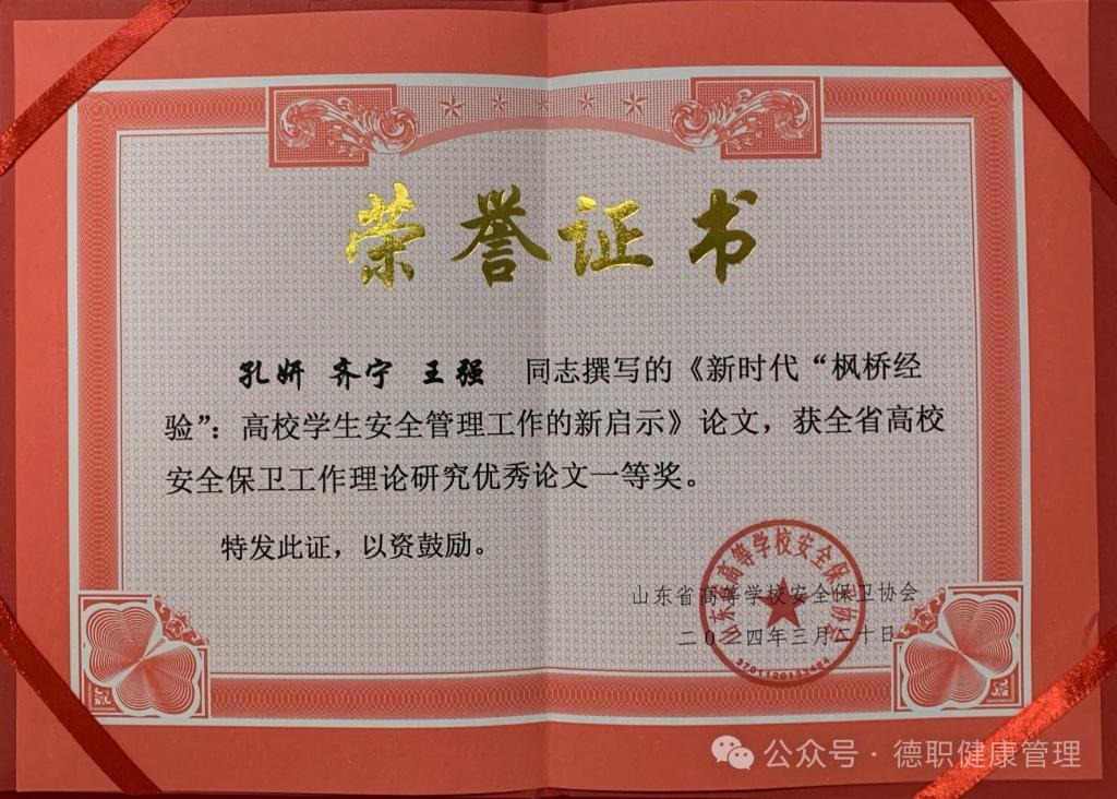 近日,山东省高等学校安全保卫协会公布了《关于表彰山东省安全保卫工作理论研究优秀成果的决定》,公司“护航成长”辅导员工作室成员孔妍、齐宁、王强同志撰写的论文《新时代“枫桥经验”:高校员工安全管理工作的新启示》脱颖而出,荣获一等奖,是唯一荣获一等奖的高职院校。