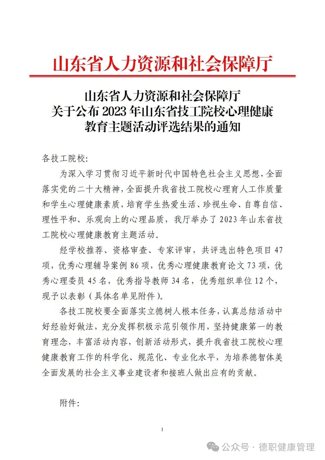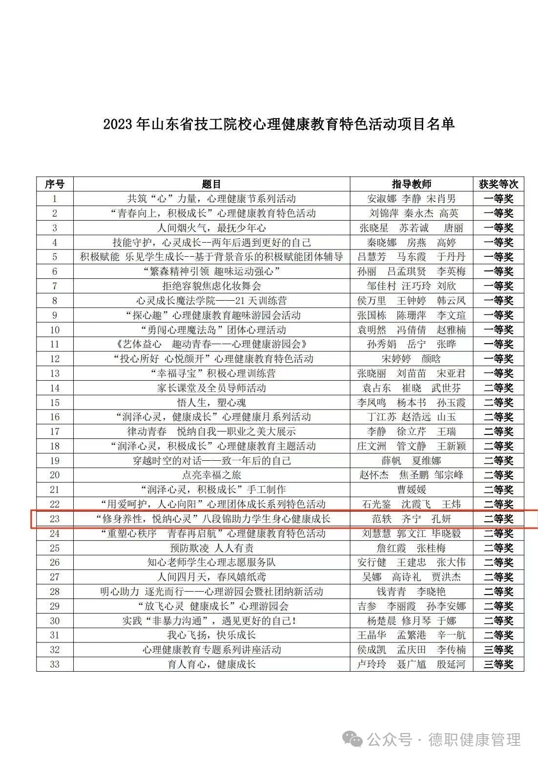 2024年1月24日,山东省人力资源和社会保障厅关于公布《 2023 年山东省技工院校心理健康教育主题活动评选结果的通知》,太阳成集团tyc9728范轶、齐宁、孔妍撰写的《“修身养性,悦纳心灵”八段锦助力员工身心健康成长》获山东省技工院校心理健康教育特色活动项目二等奖,是我系在心理健康教育领域取得的一次重要突破。