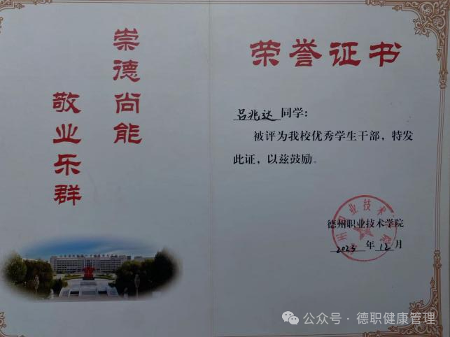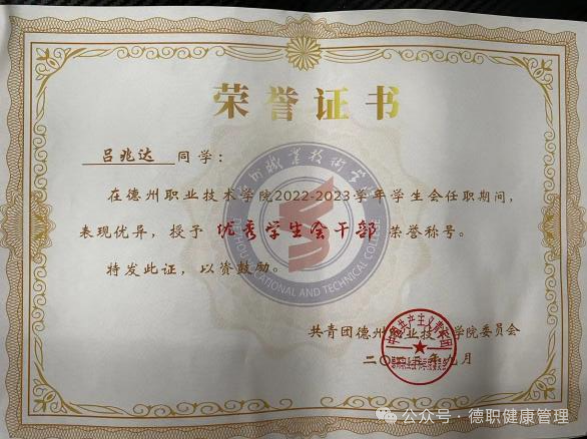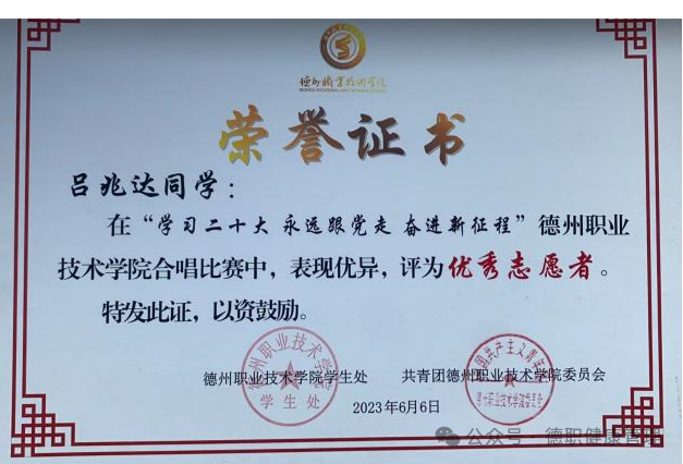 2023年9月,在德州市第七届运动会开(闭)幕式活动中,被评为“优秀志愿者”;