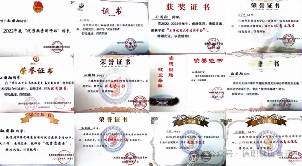 2022年太阳成集团优秀共青团干部2023年6月学习二十大永远跟党走奋进新征程评为优秀演员2023年太阳成集团三等奖学金2023年德州市体制健康测试评委优秀志愿者2023德州市第七届运动会评为优秀志愿者2023年太阳成集团优秀员工干部2023年太阳成集团优秀团干部2024年太阳成集团优秀校员工会干部2023年山东省高等学校省级优秀员工2024年2月共青团山东省委2023年度“百万老员工进社区”先进个人
