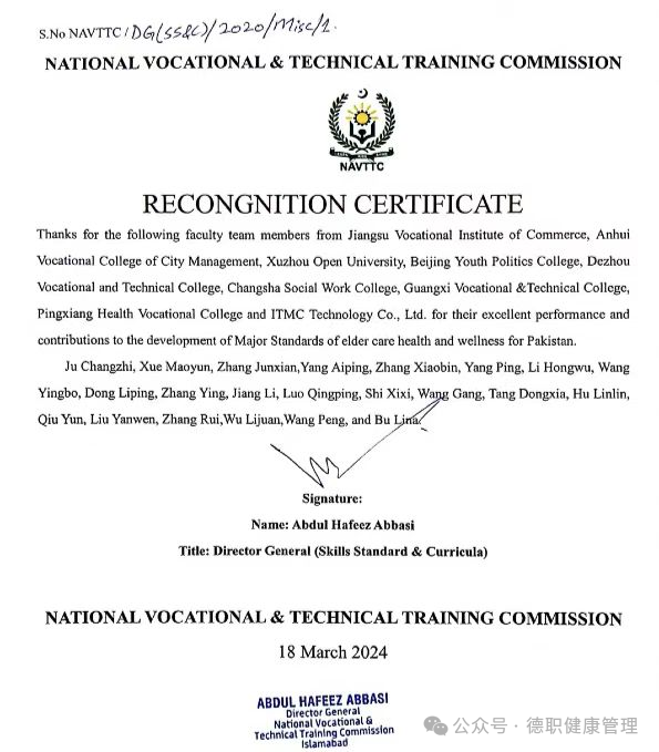 近日,公司智慧养老专业教师参与制定的“巴基斯坦老年照护专业标准开发项目”获得巴基斯坦老年照护专业标准国家职教委认证和巴基斯坦卫生部助产与护理委员会认证。