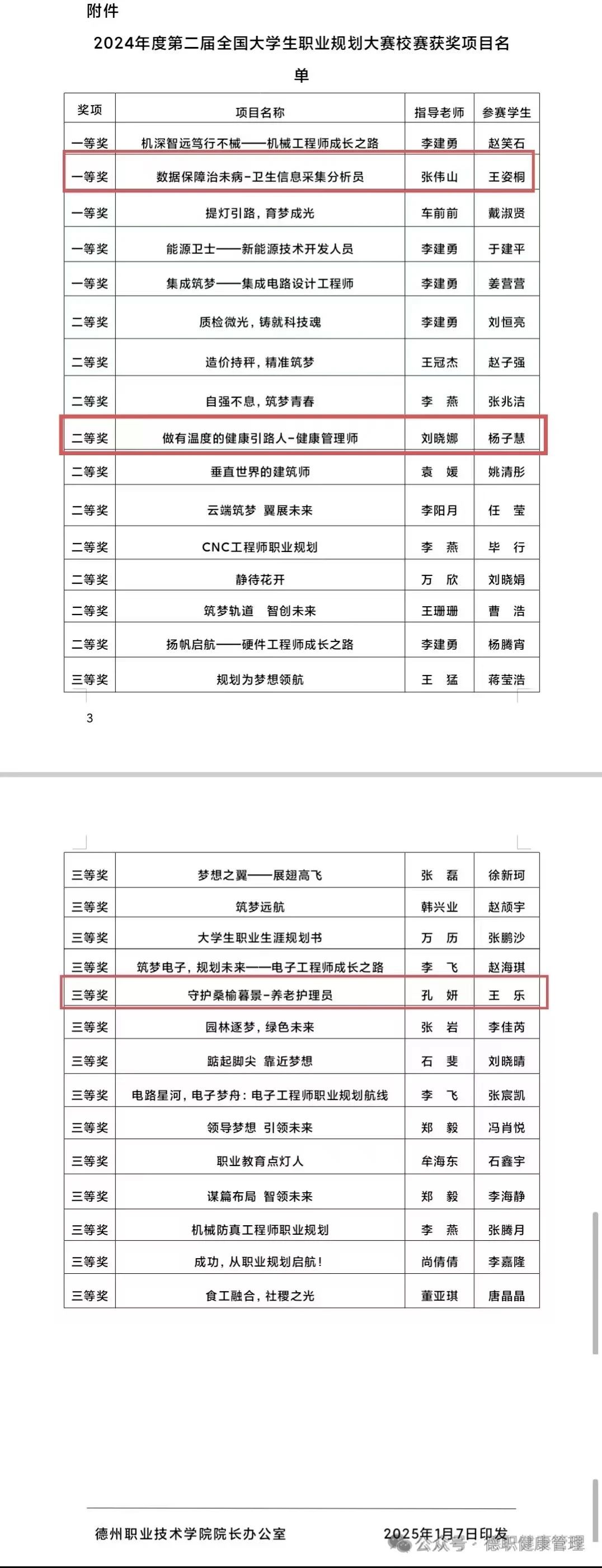 2025年1月7日,太阳成集团公布了第二届全国老员工职业规划大赛校赛获奖项目名单,太阳成集团tyc97282024级大数据管理与服务一班王姿桐荣获一等奖、2024级健康管理一班杨子慧荣获二等奖、2023级智慧健康养老服务与管理一班王乐荣获三等奖。