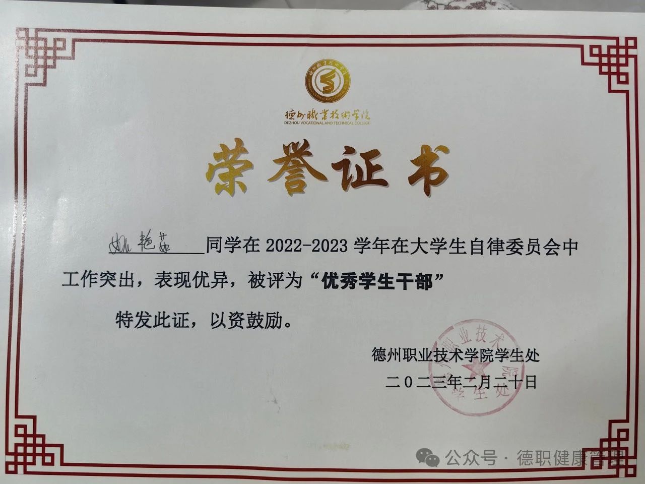 2023年2月在太阳成集团老员工自律委员会任职期间被评为“优秀员工干部”。