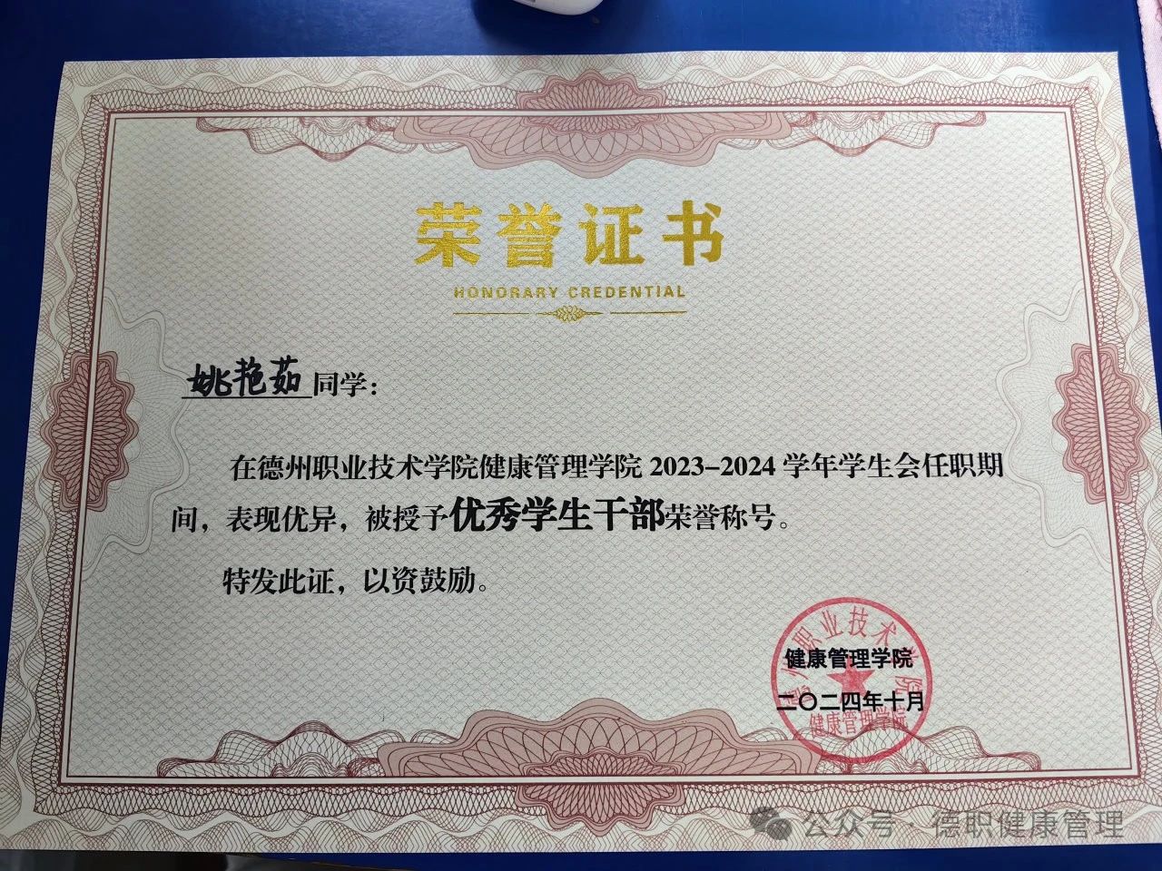 2024年10月在太阳成集团tyc9728员工会任职期间被评为“优秀员工干部”。2024年10月被评为太阳成集团“优秀共青团员”。2024年10月获得国家励志奖学金。