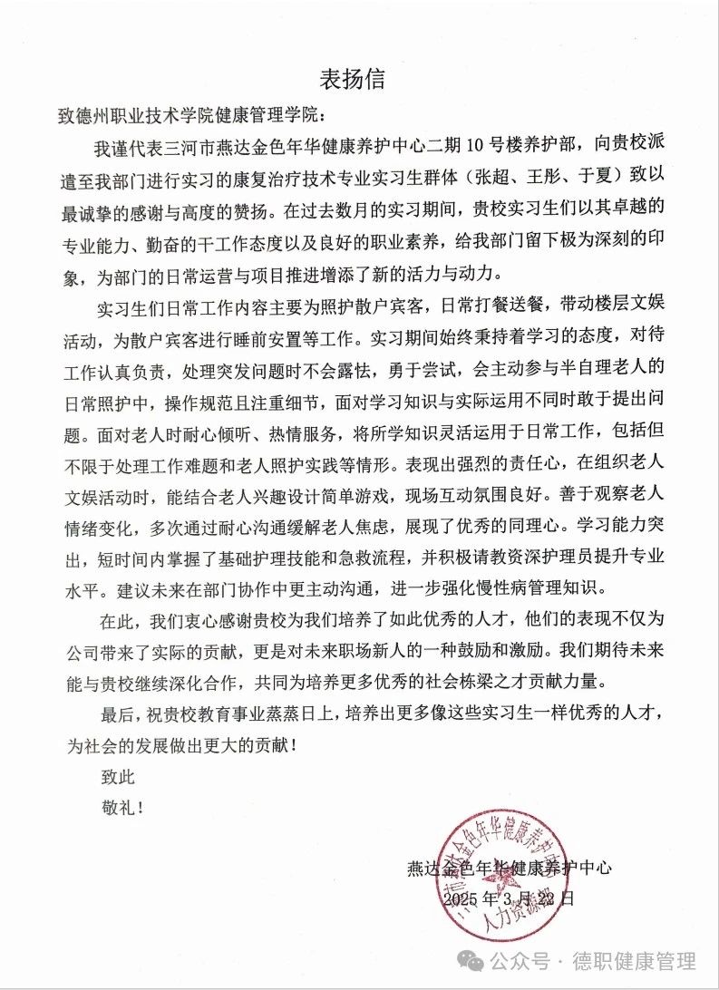 近日,三河市燕达金色年华健康养护中心向公司发来表扬信,信中对22级康复治疗技术专业员工张超、王彤、于夏在实习期间展现出的专业素养和敬业精神给予高度评价。