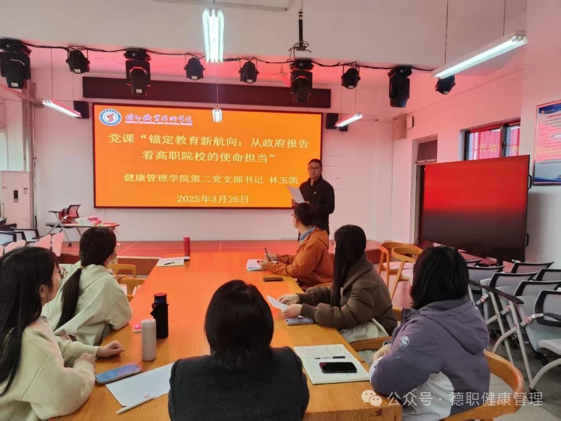 支部书记林玉凯同志讲党课,党课题目为《锚定教育新航向:从政府报告看高职院校的使命担当》,重点从三个方面进行了讲解(1)2025年政府报告教育论断重点解读;(2)高职院校在教育强国建设中的使命;(3)基层党支部在高职教育中的担当。充分发挥党支部的引领作用,党员的先锋模范作用。以更加饱满的热情、更加扎实的工作,贯彻落实政府报告教育论断,谱写高职教育发展新篇章,为教育强国建设贡献我们的力量。