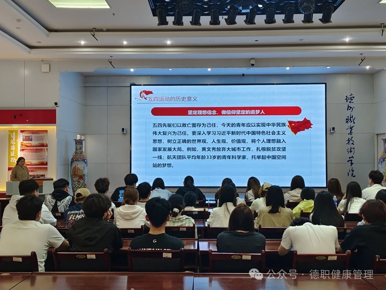 座谈会由宁丽慧老师主讲,她以“五四”运动的历史背景、重要意义为切入点,深入且全面地阐释了“五四”精神的丰富内涵。宁老师旁征博引,结合历史事件和时代发展,为同学们上了一堂生动的思政课,让大家对“五四”精神有了更深刻的认识。