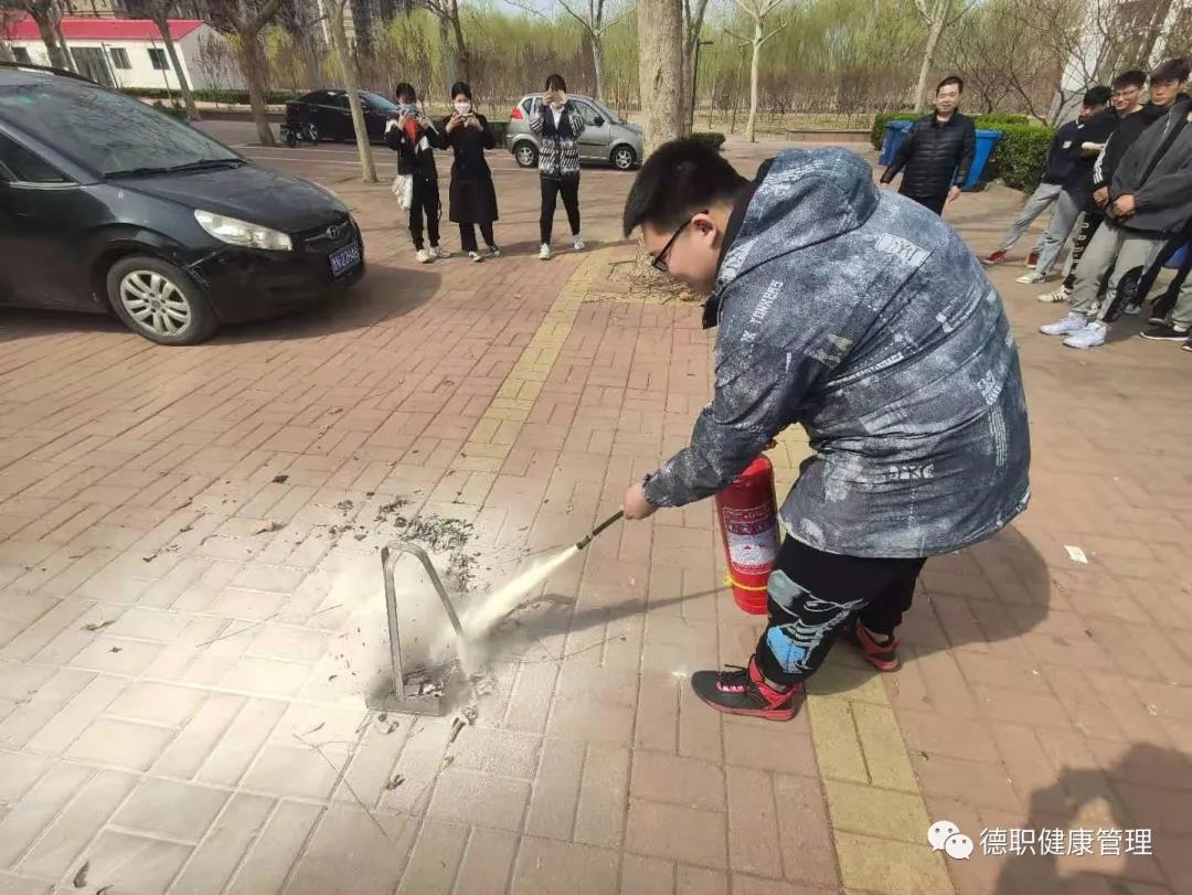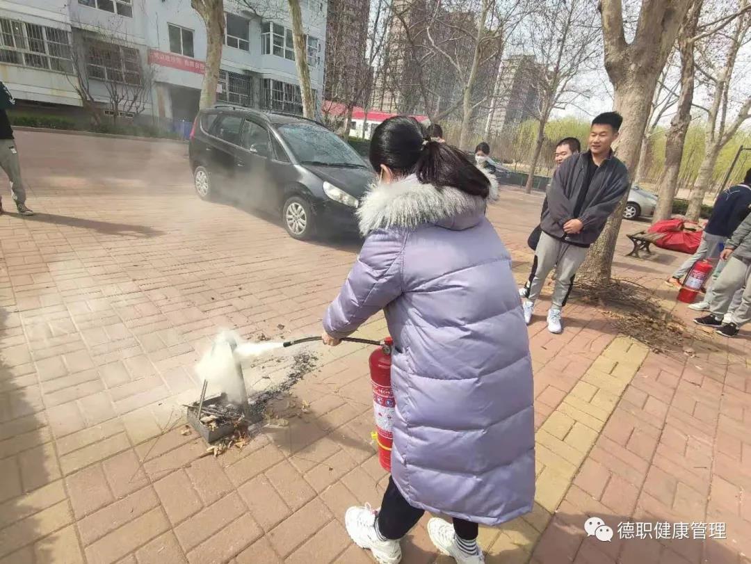 疏散完毕后,员工们站在消防器械前,认真倾听孙小龙老师给大家讲解消防器械正确的使用方法。